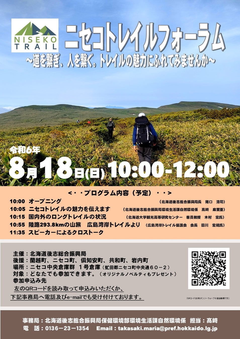 後志の中央部を東西に横断するニセコ山系を雷電海岸からニセコひらふ坂まで一本の線を描くように整備しているニセコトレイルを知ってもらい、広くアピールすることを目的として、下記のとおり、本フォーラムを開催いたします。「ニセコトレイル」にご興味のある方でしたら、どなたでもご参加いただけますので、ご来場お待ちしております!