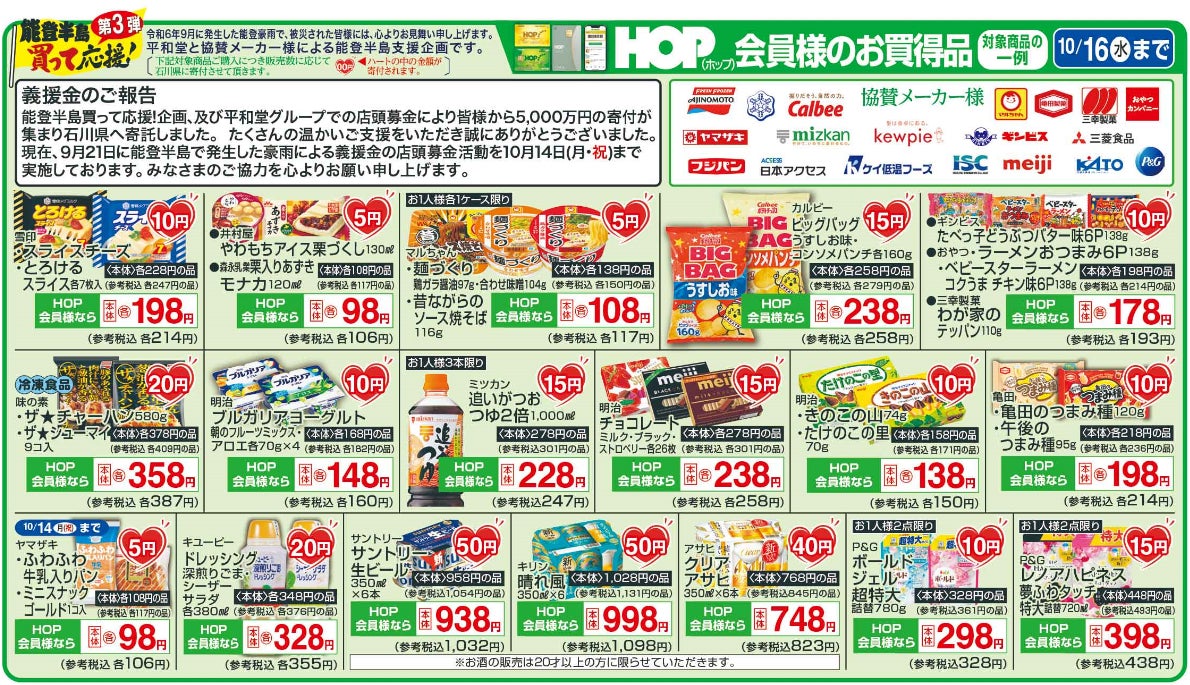 この企画は、食品メーカーや卸・問屋といった多くのお取引先様のご賛同のもと、2024年2月に初めて実施しました。お客様にはHOPカード会員様優待価格として、通常よりもお求めやすく商品をご購入いただき、あらかじめ商品ごとに設定した金額を平和堂と協賛する各社で負担し、寄付金として石川県にお渡しします。