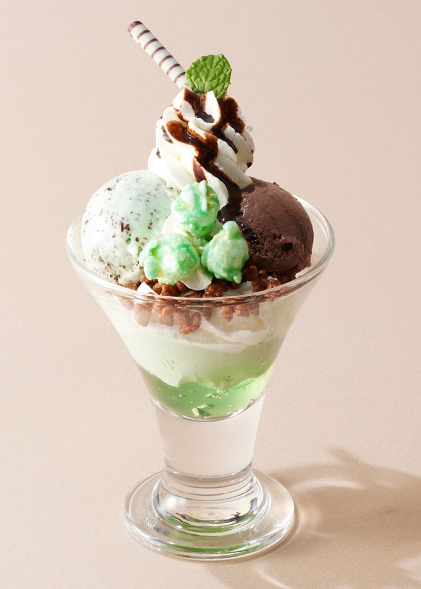 チョコミントアイスをはじめ、ミントポップコーンやミントゼリー、ミントパンナコッタの爽やかな風味と、ガトーショコラやチョコフレーク、チョコプリンの濃厚な甘さがマッチした、チョコミン党を代表するビッグパフェです。今年はミントの爽やかさと全体の甘さのバランスにこだわりました。