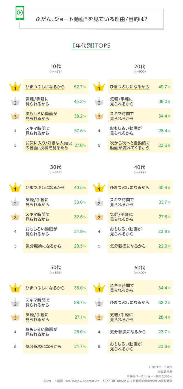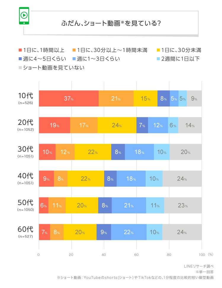 このたびLINEリサーチでは、全国の10〜60代の男女を対象に、普段ショート動画(※)をどのくらい見ているか、また、ショート動画を見ている理由について調査しましたので、その結果をお知らせします。