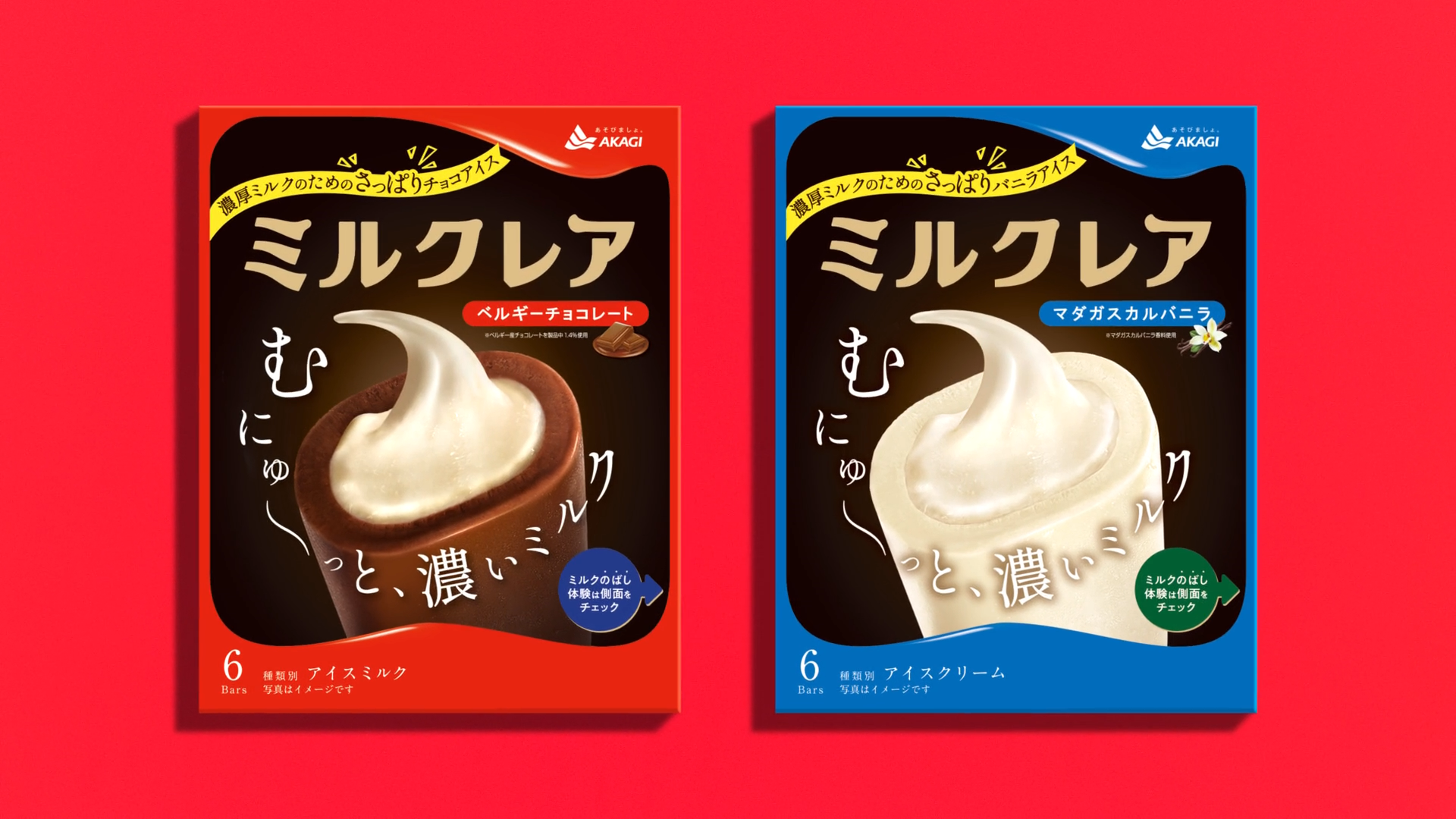 「ミルクレア」は、むにゅ~っと伸びる濃厚ミルクを美味しく食べていただくために、あえてさっぱりとした味わいのアイスで包んだバーアイスです。