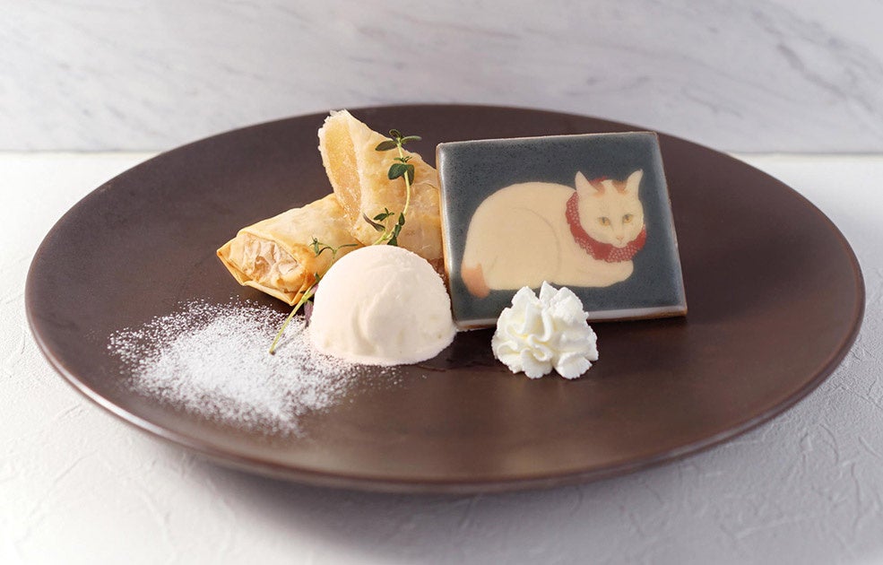 蜂蜜でコンポートした紅玉りんごをパートフィロで包んだパリパリアップルパイ。バターの香りたっぷりでカリッと軽い生地と、甘酸っぱいりんごのコントラストが特徴です。赤ワインとバルサミコのソースを添えて大人のアップルパイに仕上げました。「高橋弘明(松亭)<白猫>」をプリントしたアイシングクッキー付き。