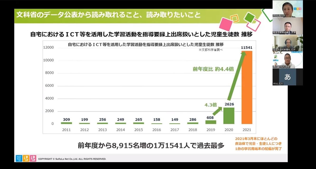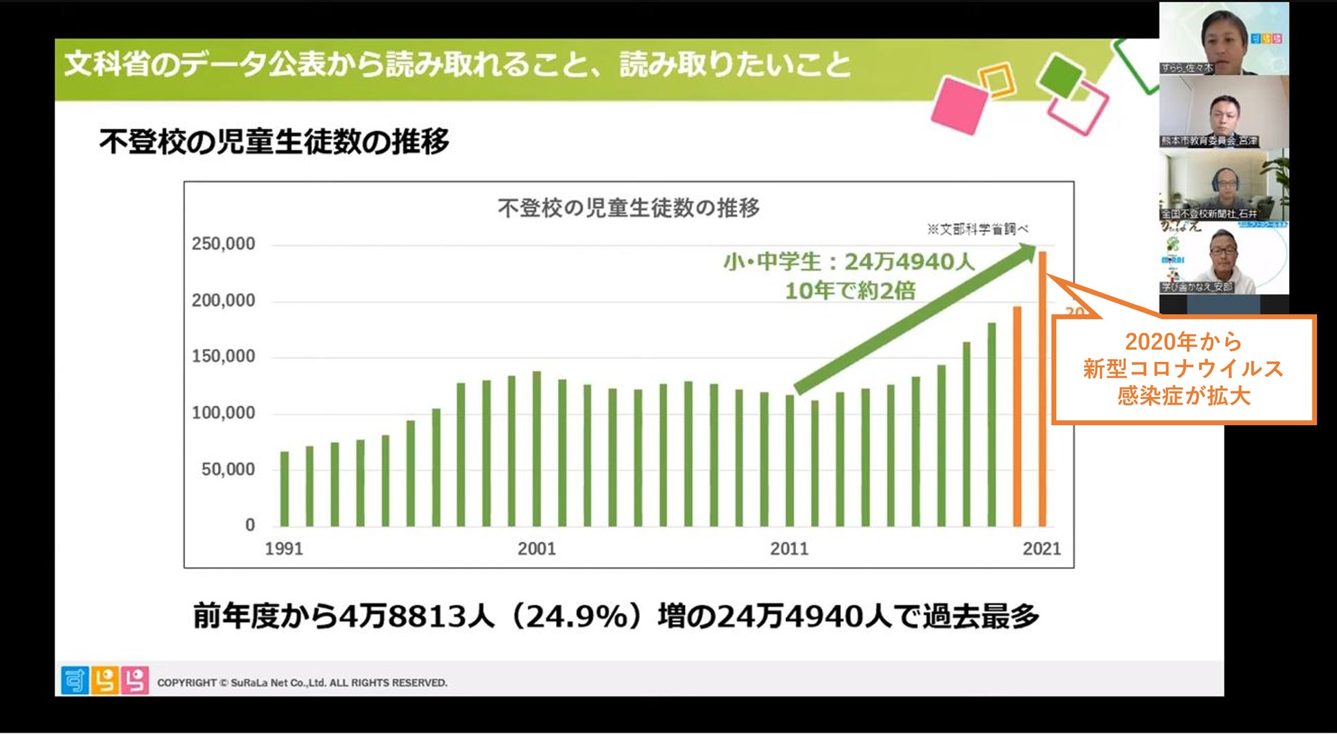 アダプティブな対話式 ICT 教材の開発と提供を行う株式会社すららネット(本社:東京都千代田区、代表取締役:湯野川孝彦)では、2022年10月に文部科学省から公表された「令和3年度 児童生徒の問題行動・不登校等生徒指導上の諸課題に関する調査結果について」を受けて、2022年11月4日(金)に「不登校児童20万人時代に、考えたいこと」を開催しました。