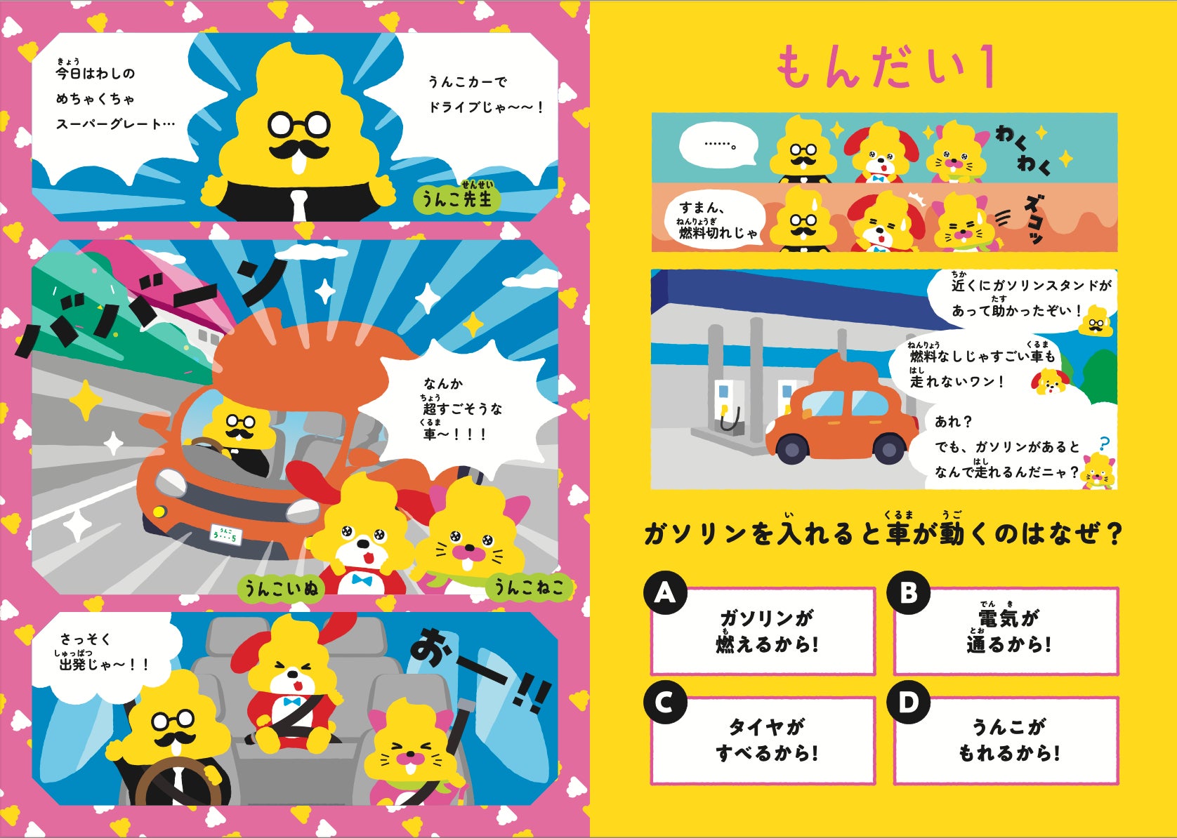 冊子『うんこドリル エネルギー 石油編』では、うんこ先生・うんこねこ・うんこいぬが登場し、