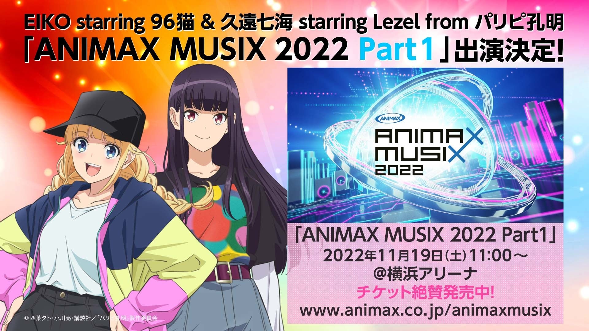 さらに、同日TVアニメ「パリピ孔明」をアニマックスで全12話一挙放送するほか、11月19日(土)に横浜アリーナで開催するアニメミュージックの祭典『ANIMAX MUSIX 2022 Part1』にEIKO starring 96猫 & 久遠七海 starring Lezel from パリピ孔明の出演が決定!!