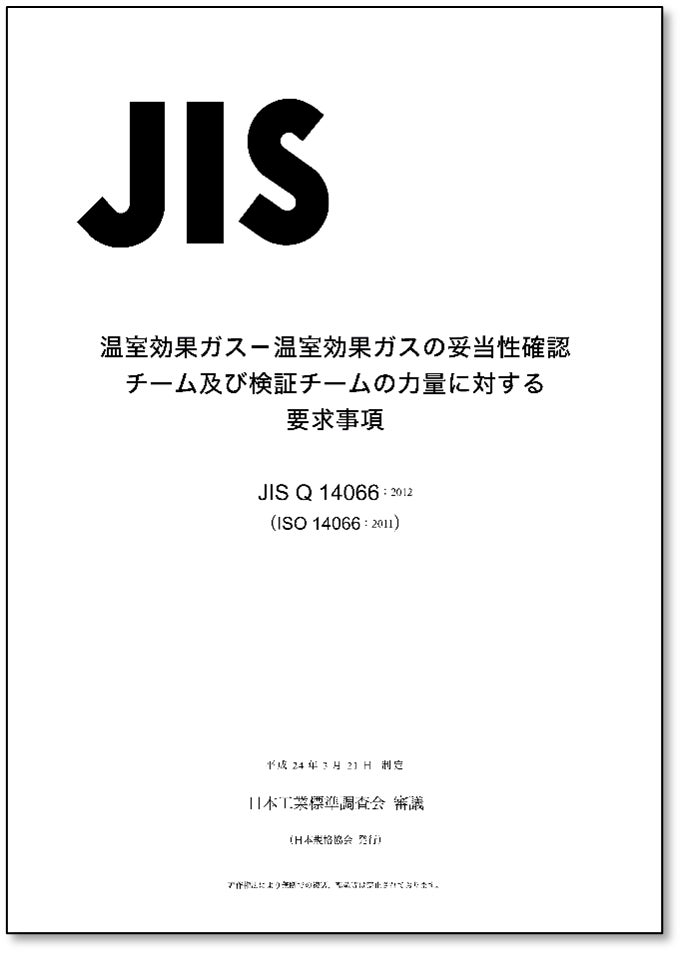 JIS Q 14066:2012 温室効果ガス―温室効果ガスの妥当性確認チーム及び検証チームの力量に対する要求事項 Greenhouse gases -- Competence requirements for greenhouse gas validation teams and verification teams