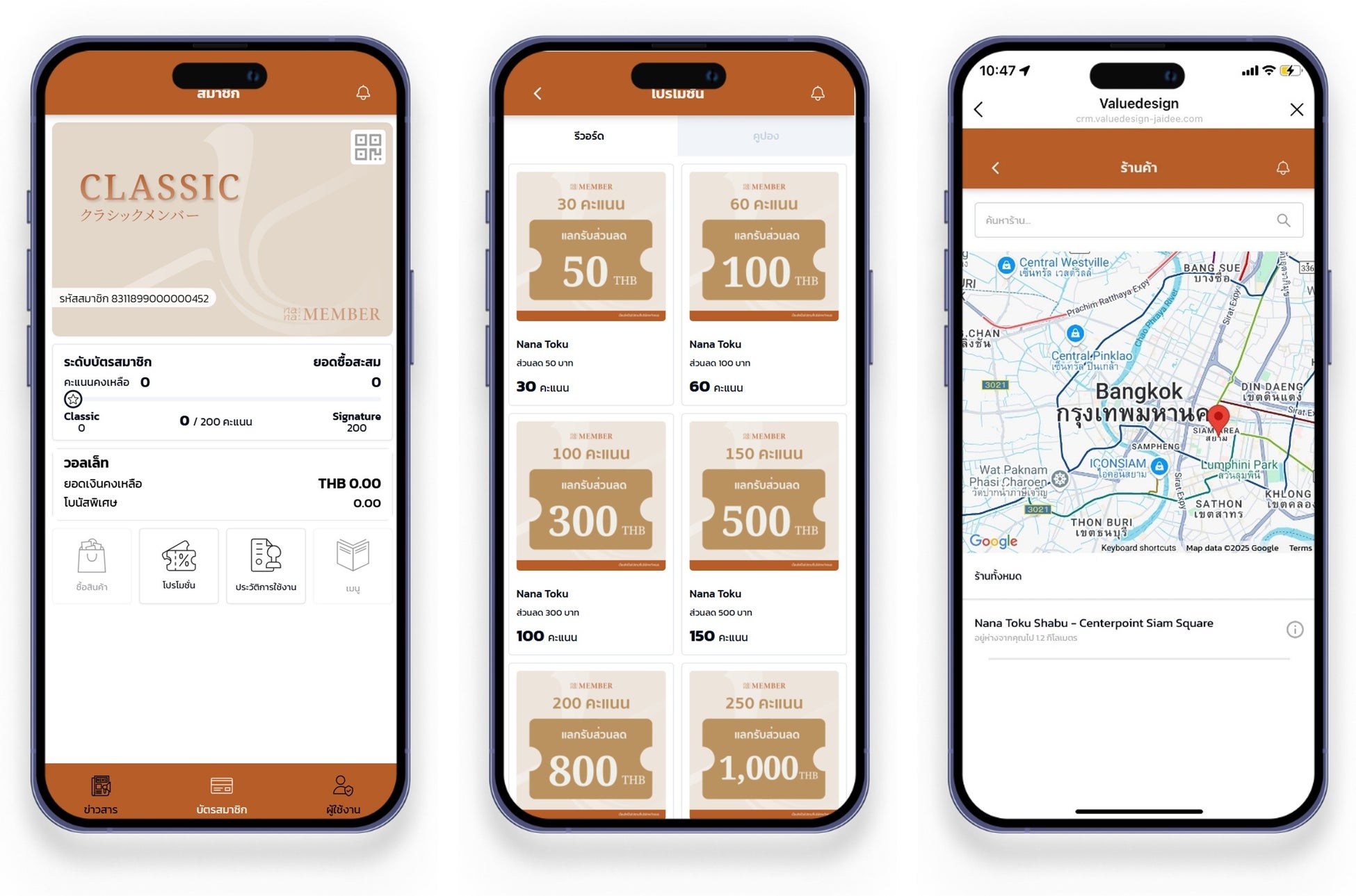 バリューデザインが今回サービスを提供した「Nana Toku」は、現在タイに1店舗を構える、しゃぶしゃぶレストランです。厳選された高品質な食材の選定に加え、心安らぐ店内空間の演出まで、細部にこだわった店づくりをしています。2025年7月から会員のリピート促進を目的にモバイルCRMサービスを導入されました。メンバーズカードは、100バーツのお支払いごとに1ポイントを付与。貯まったポイント数に応じて会員ランクがアップします。