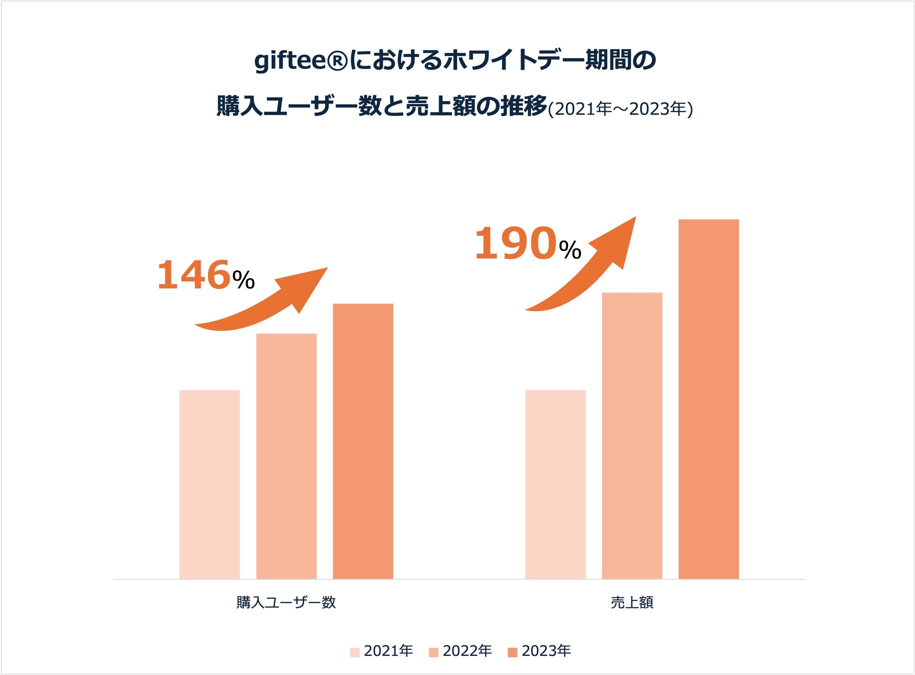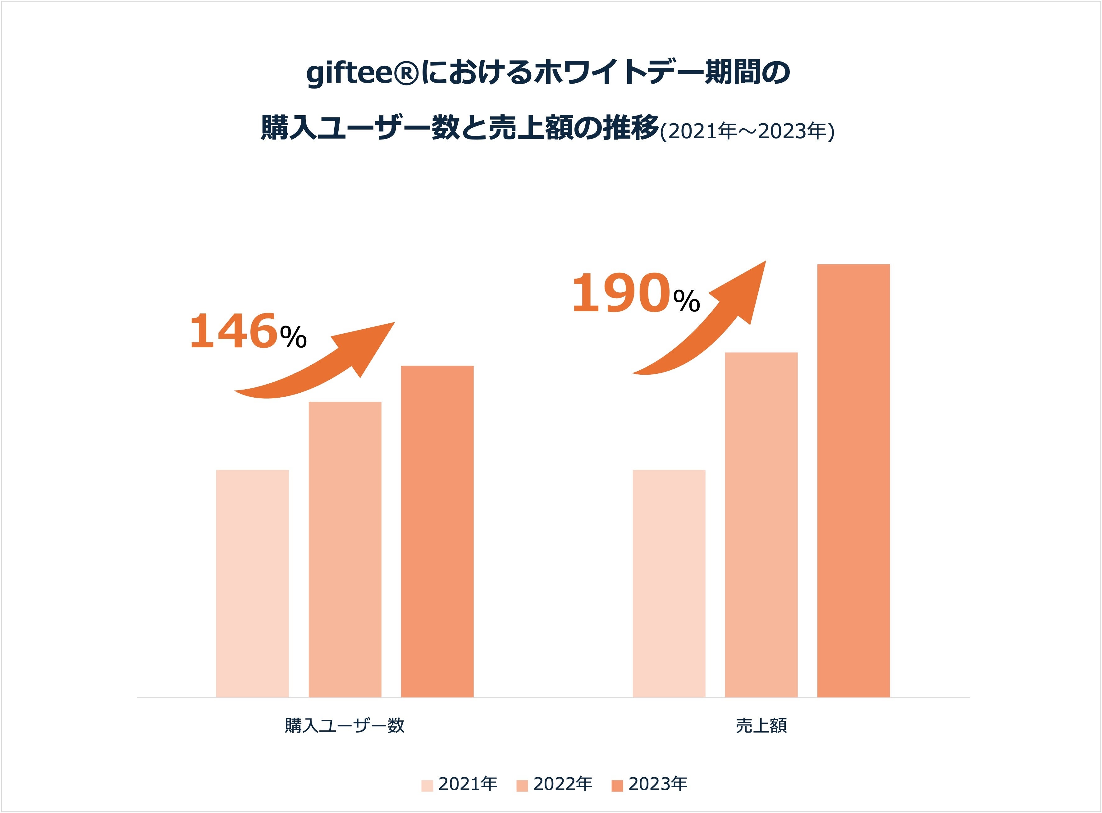 ◾️2023年のホワイトデー期間における売上は2021年同期比で190%増加、購入ユーザー数および平均購入単価も大きく伸長