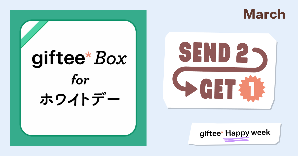 3月7日(木)〜3月13日(水)のgiftee Happy Weekの期間中、「giftee Box for ホワイトデー」のいずれかのポイントを2つ贈ると、贈った方も「giftee Box for ホワイトデー」500ポイントが1つもらえる「ホワイトデーを贈ろう!Send2 Get1キャンペーン」を開催いたします。