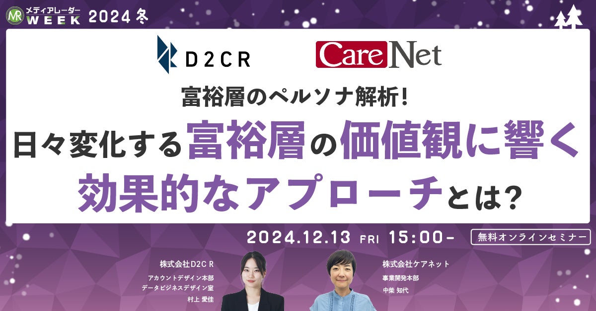 株式会社アイズ(所在地:東京都渋谷区、代表取締役社長:福島範幸、東証グロース:5242)が運営するNo.1*の広告業界のプラットフォーム「メディアレーダー」が主催するマーケティングセミナーイベント「第16回メディアレーダーWEEK 2024 冬」にて、富裕層向けマーケティングについての専門家たちが12/13(金)に登壇します。視聴申し込みは無料です。