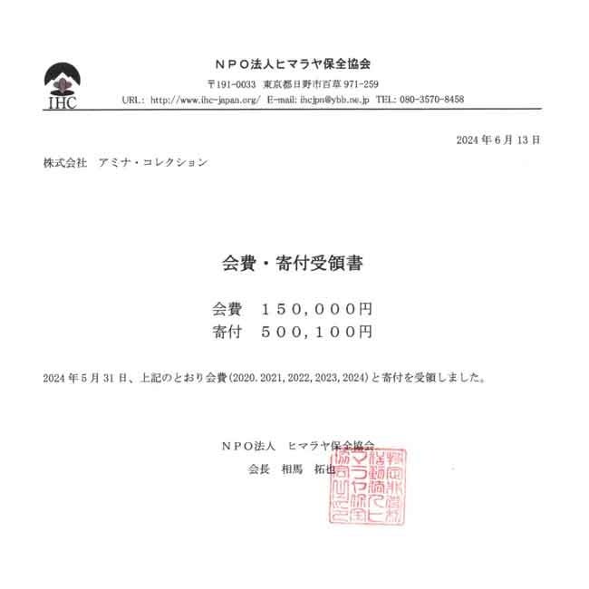 チャイハネは、ネパールへの恩返しの意味も込めてSAVE TREE プロジェクトを2000年に立ち上げ、ネパール製品の売り上げの一部を、NPO法人ヒマラヤ保全協会を通じて植林事業を支援しています。今年度も、2024年6月13日付でNPO法人ヒマラヤ保全協会へ、50万100円の寄付を行いました。