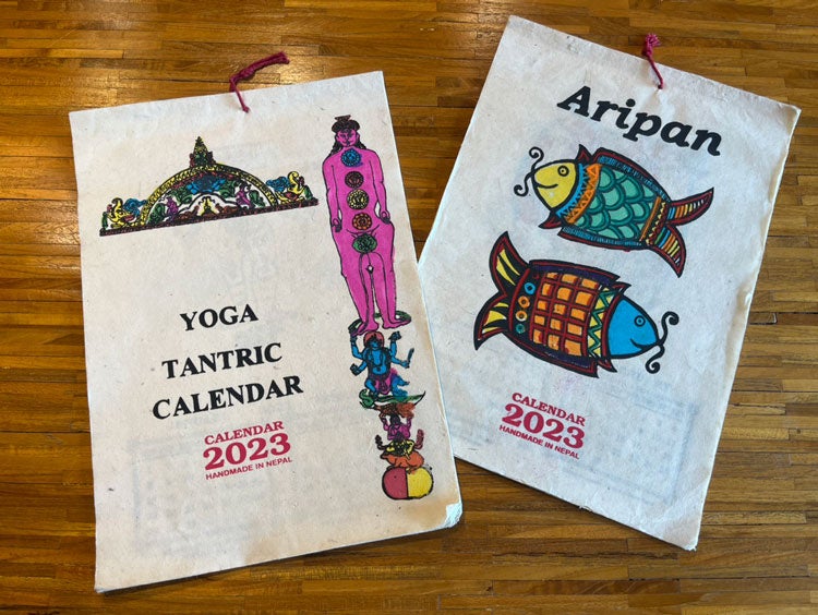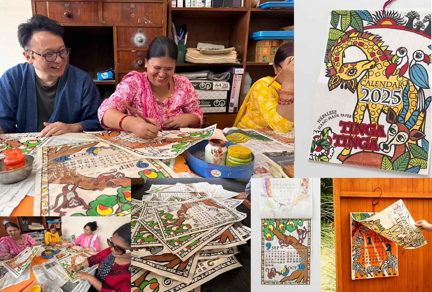 2024年の今でも、毎年ネパール手漉き紙のオリジナル「カレンダー」は、日本でデザイン、ネパールで生産し、日本で販売し続け、皆様に愛用いただいている超ロングセラーです。手漉き紙を使ったネパール製カレンダーは、昔ながらの印刷機で枠線をプリントした後、工房にて一点一点手塗りで着色されます。丁寧に作られたカラフルなカレンダーは、和室にも洋室にもマッチします。
