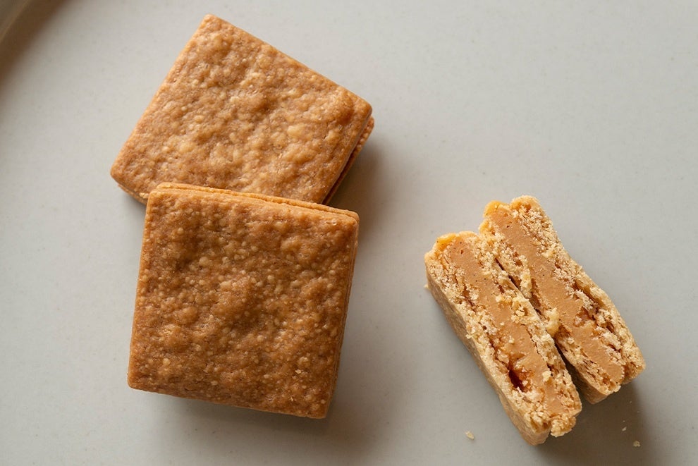 「沖縄の黒糖サブレのガナッシュサンド」は、黒糖を練り込んだサブレ生地に、黒糖の風味を活かした異なるガナッシュクリームをサンドした焼き菓子です。4種類の味わいに仕上がりました。