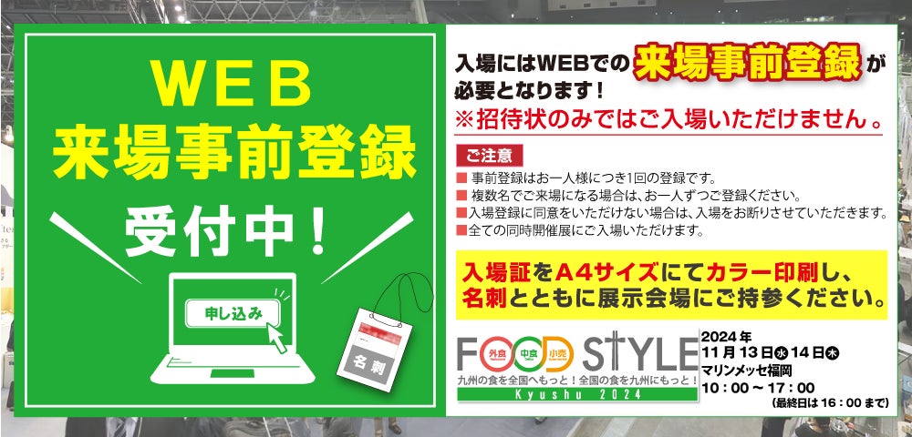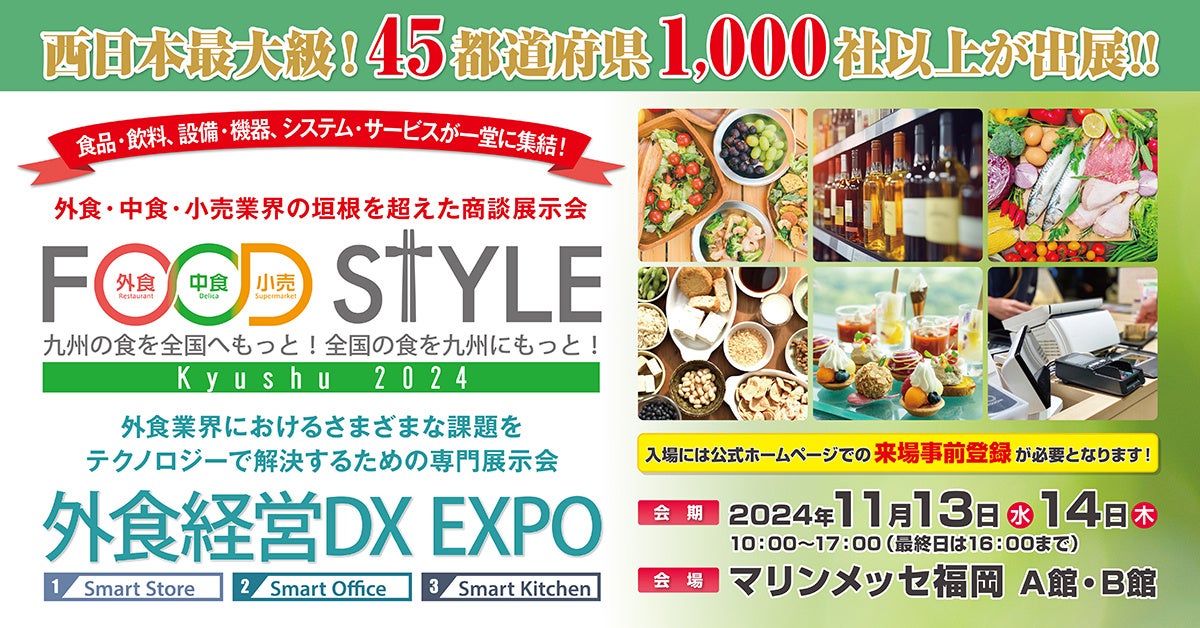 FOOD STYLE Kyushu 実行委員会(所在:東京都港区、運営:株式会社イノベント)は、11月13日(水)・14日(木)の2日間、マリンメッセ福岡A館・B館にて、FOOD STYLE Kyushu 2024/外食経営DX EXPOを開催いたします。