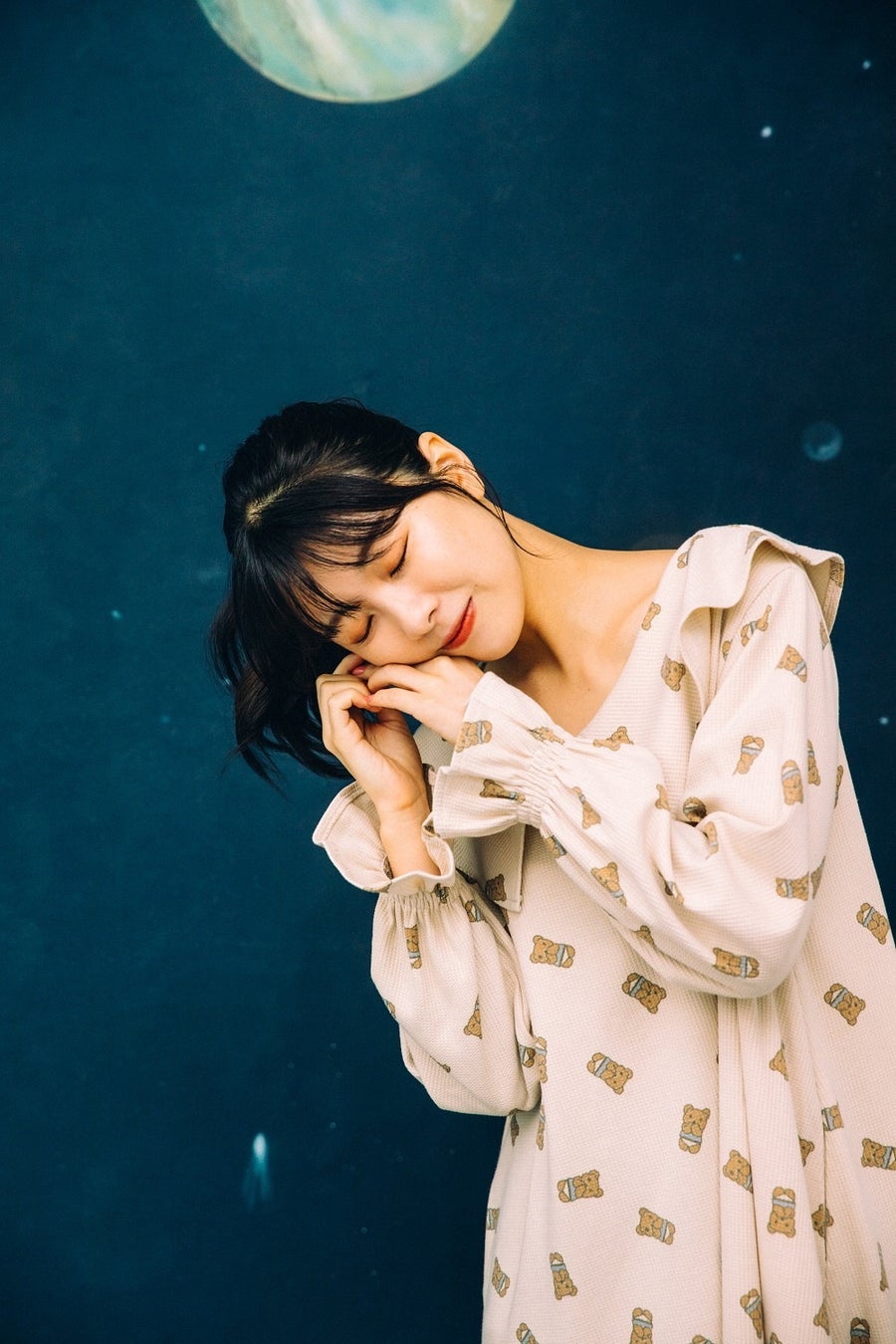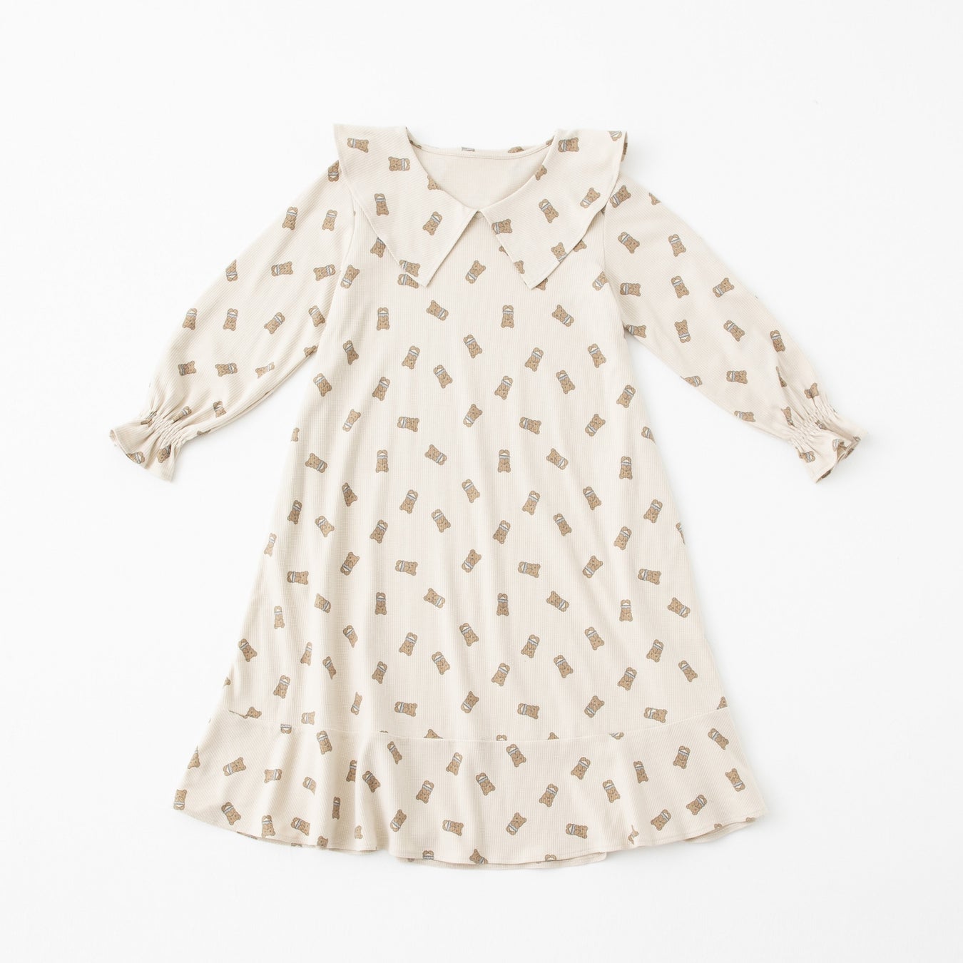 全体にくまのプリントを施したワンピースは襟元と裾のフリル使いがフェミニンな印象に。