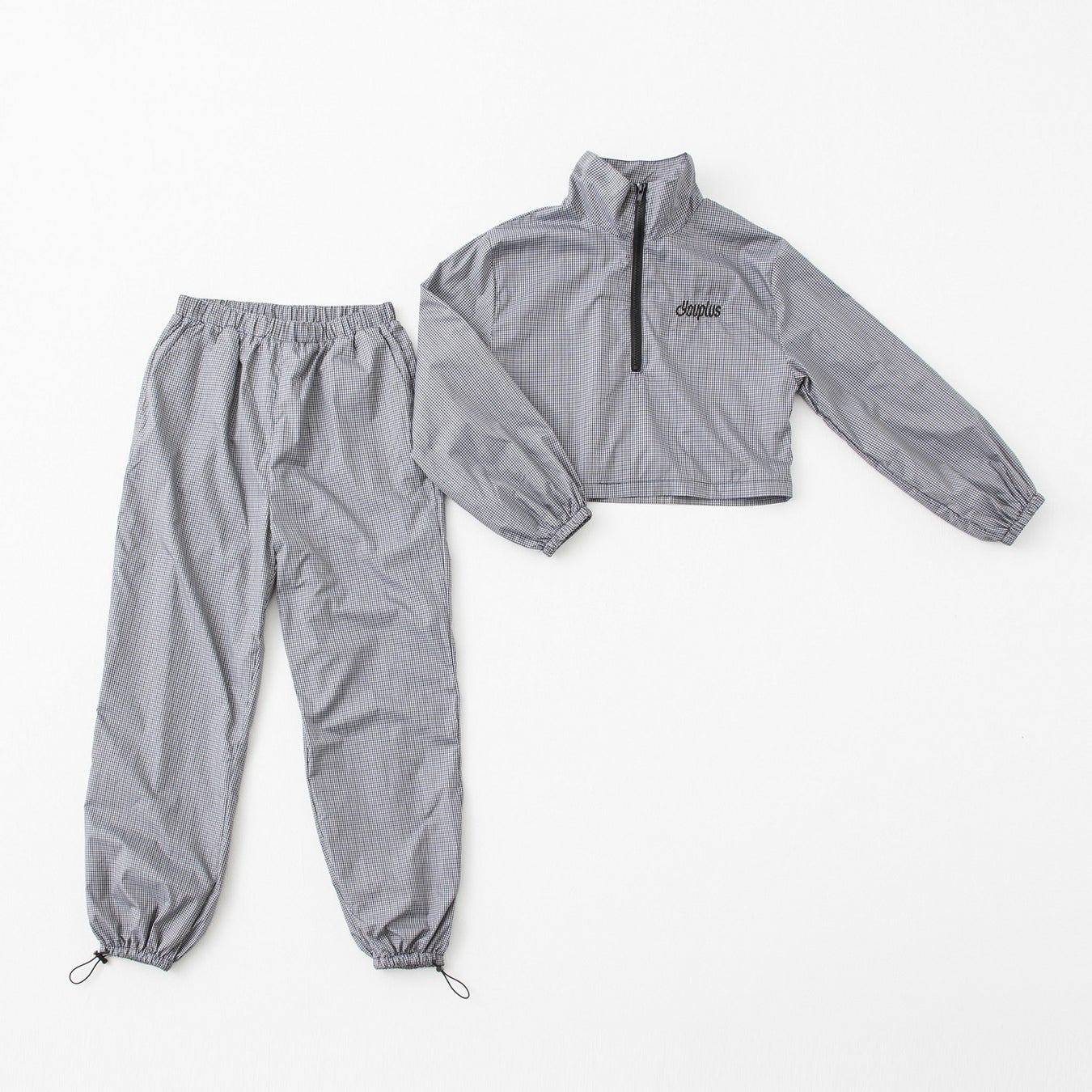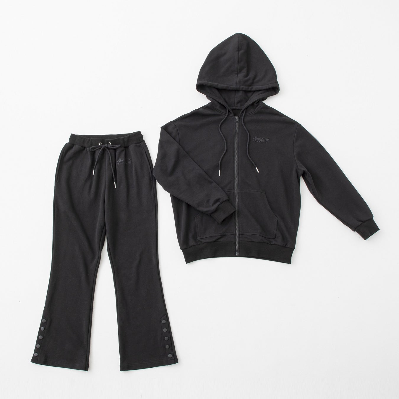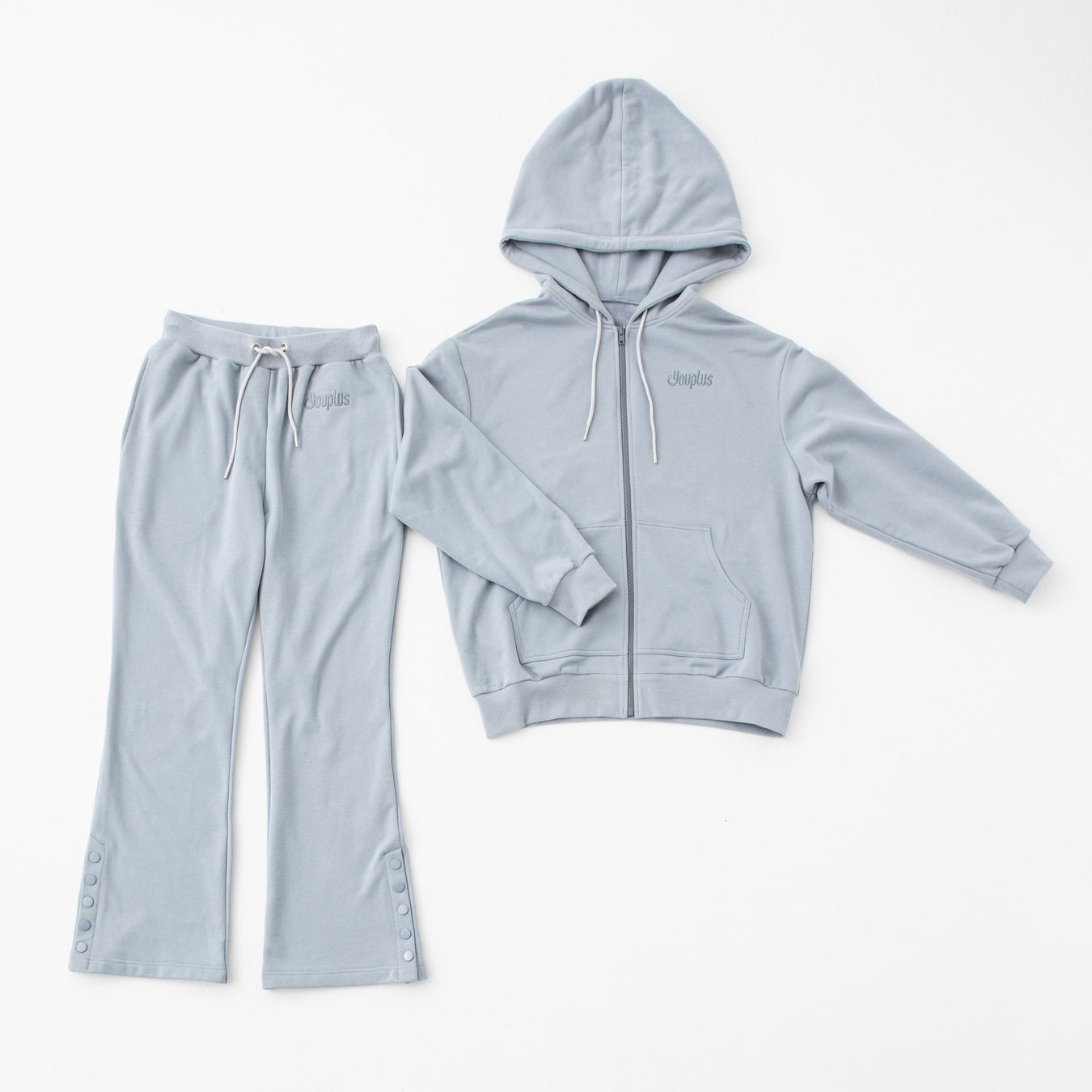 トップスとボトムに「Youplus」のロゴをあしらったセットアップは上下別でも着られて様々なスタイリングにマッチ。裾のボタンは開閉できる仕様なのでシューズに合わせた着こなしを楽しめます。