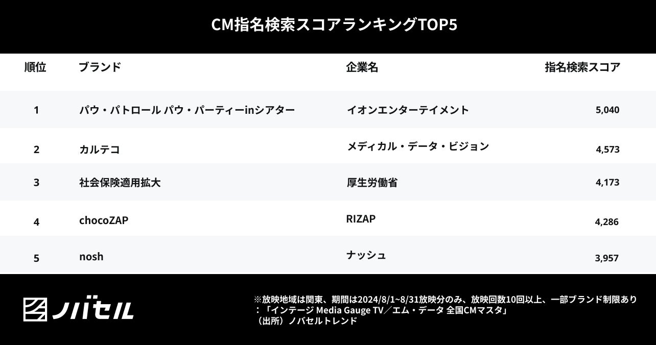 あらゆるテレビCMの指名検索スコアが可視化できる「ノバセルトレンド」にて、2024年8月の指名検索スコア順テレビランキングをご紹介します。