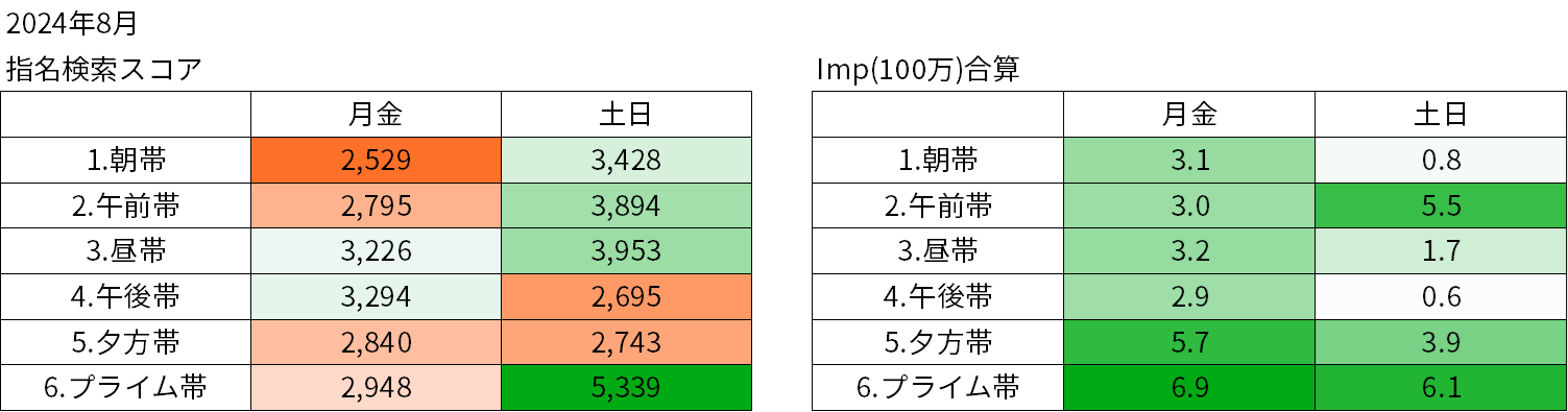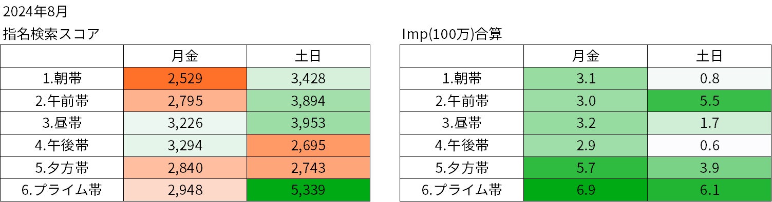 指名検索スコアは土日のプライム帯が最も高くなっています。平日プライム帯の放映量も多いので、平日働く層が帰宅後にテレビCMを見て土日に検索した方も多いのではと考えられます。