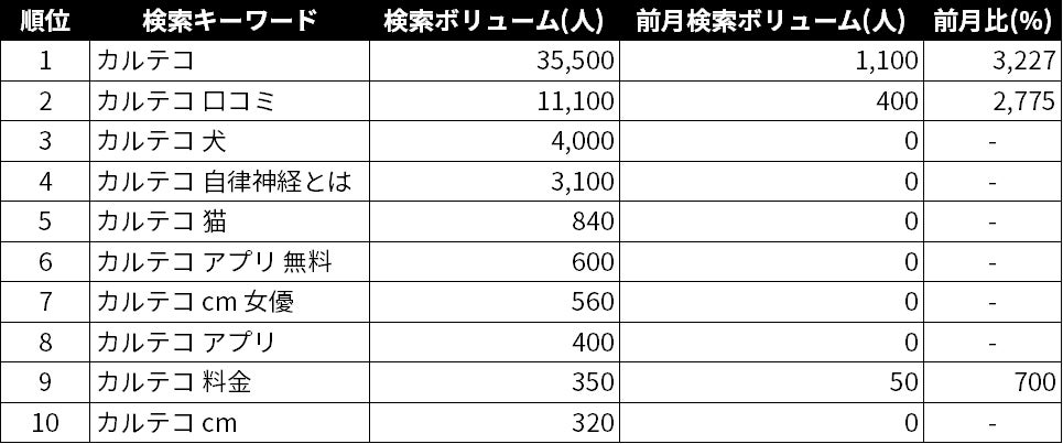 テレビCMの放映開始が8月だったため、前月には検索されていないキーワードがランキングに反映されているのがわかります。特に「カルテコ 自律神経とは」というキーワードは「自律神経を計測できる」というテレビCMの訴求内容から気になった方が多くいたと推測できます。猛暑で体の負担が大きく、疲れが取れない悩みを抱える方が多かったという背景もあるのではないでしょうか。