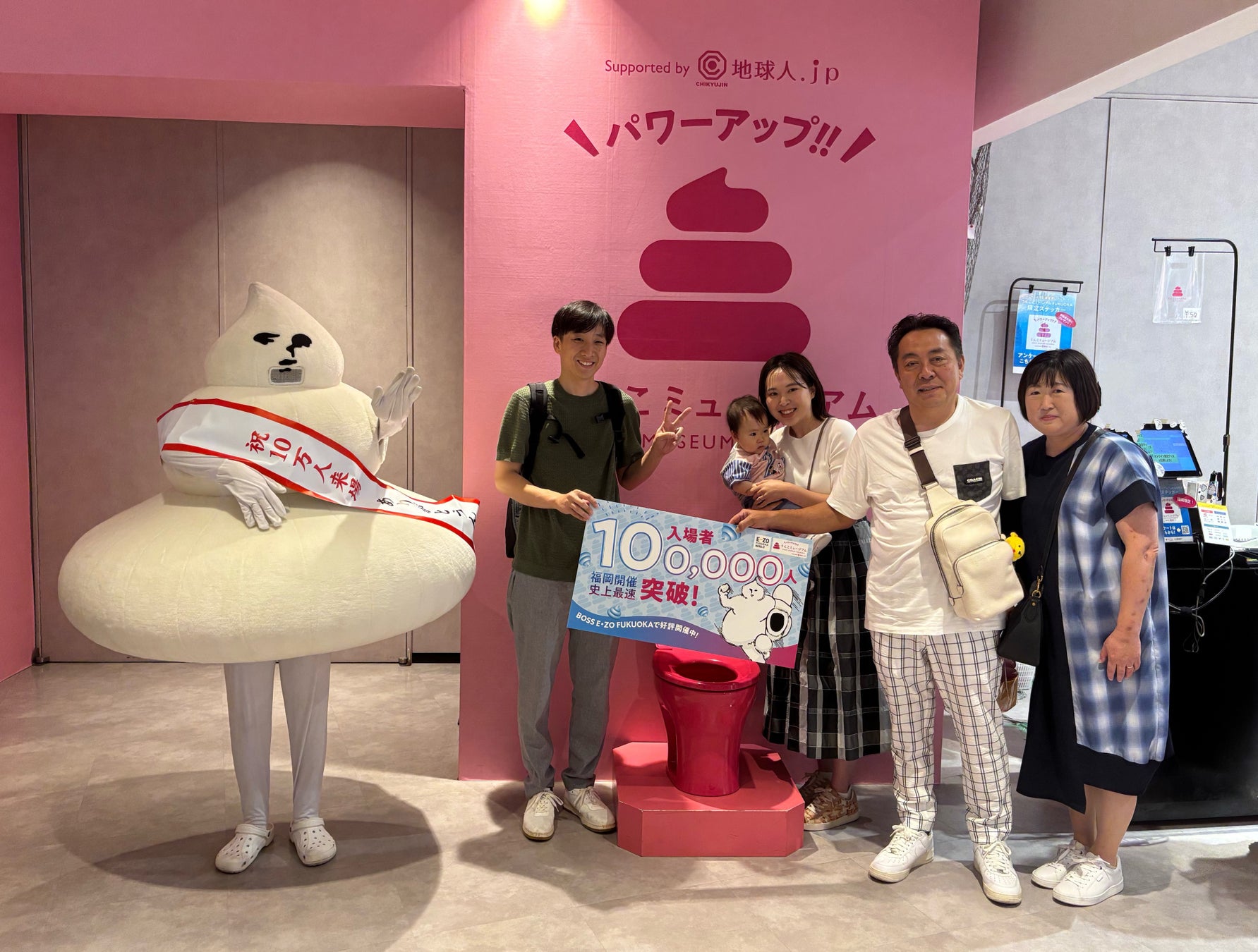 BOSS E・ZO FUKUOKA イベントホールにて開催中の「\パワーアップ!!/うんこミュージアム FUKUOKA Supported by地球人.jp」の来場者が8月9日(土)に、福岡開催史上最速で10万人を突破しました!これを記念し10万人目のお客様にはうんこミュージアムの守り神・ウンベルトより、うんこミュージアムグッズ詰め合わせ・うんこミュージアムコラボグルメお食事券・みずほPayPayドーム福岡で開催の公式戦チケットを贈呈いたしました。