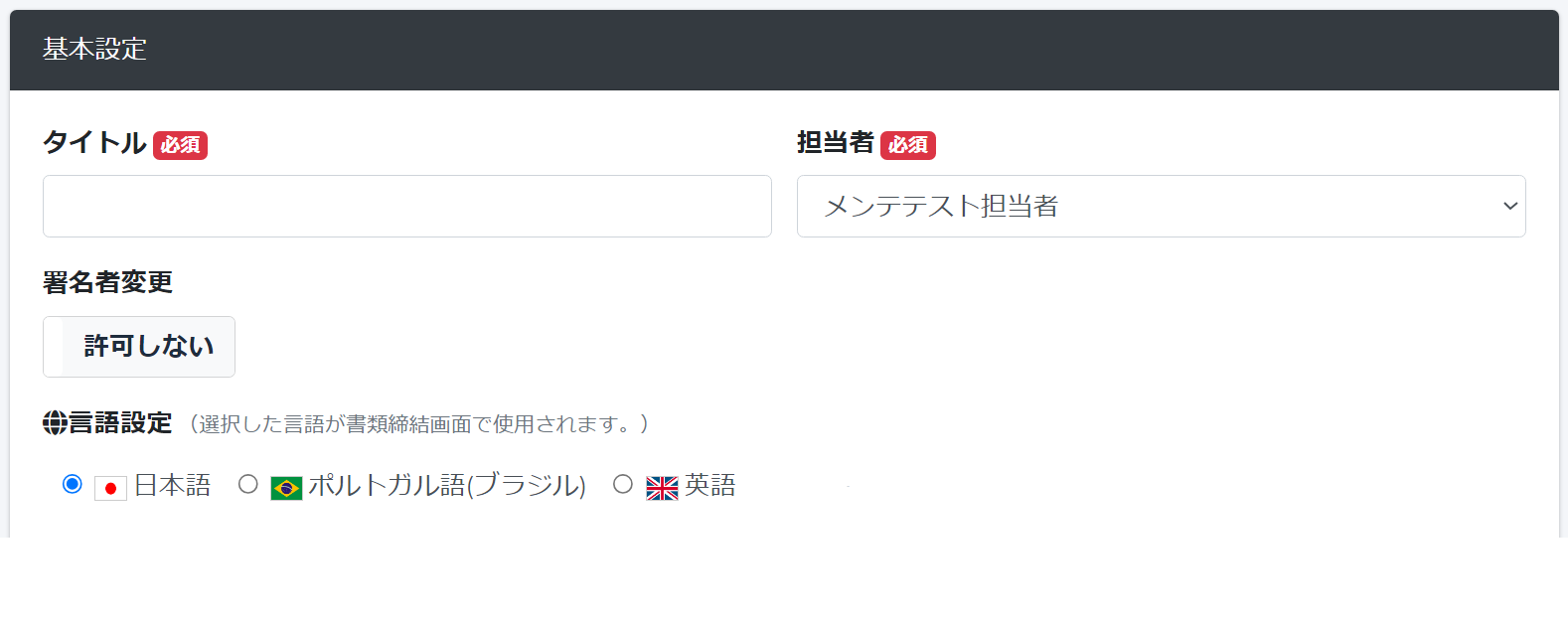 ※書類作成時の言語設定選択部分 テンプレート作成画面にも同様の箇所があります。