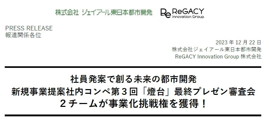 株式会社ジェイアール東日本都市開発(本社:東京都渋谷区、代表取締役社長:根本 英紀、以下 ジェイアール東日本都市開発)とReGACY Innovation Group株式会社(本社:東京都千代田区、代表取締役:成瀬 功一、以下: ReGACY Innovation Group)は、新規事業提案社内コンペ第3回「燈台」の最終プレゼン審査会を2023年12月6日(水)に実施いたしました。そしてこの度、2つの事業案が事業化挑戦権を獲得いたしました。
