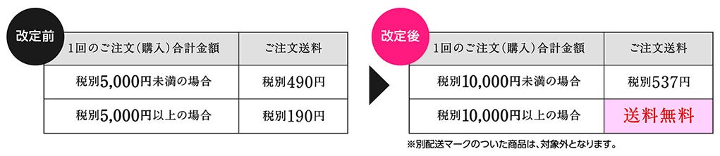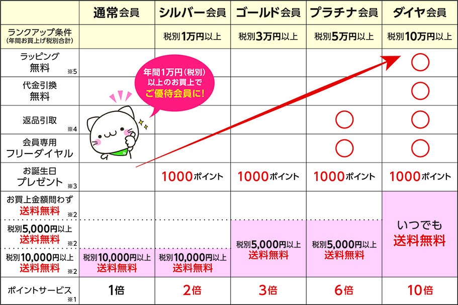 ダイヤ会員はご注文金額に関わらず、ゴールド・プラチナ会員は税別5,000円以上で、いつでもご注文送料無料になります。