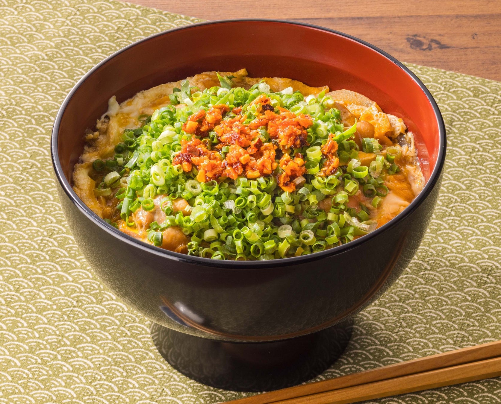\山盛りのねぎとシビ!辛!ラー油の黄金コラボ。新境地!旨辛親子丼/