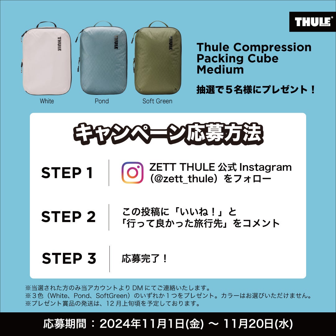 ZETT THULE公式インスタグラムアカウント(@zett_thule)をフォローし、キャンペーン投稿に「いいね」と『行って良かった旅行先』をコメントしていただいた方の中から抽選で、旅の必需品【Thule Compression Packing Cube Medium】を抽選で5名様にプレゼントいたします。