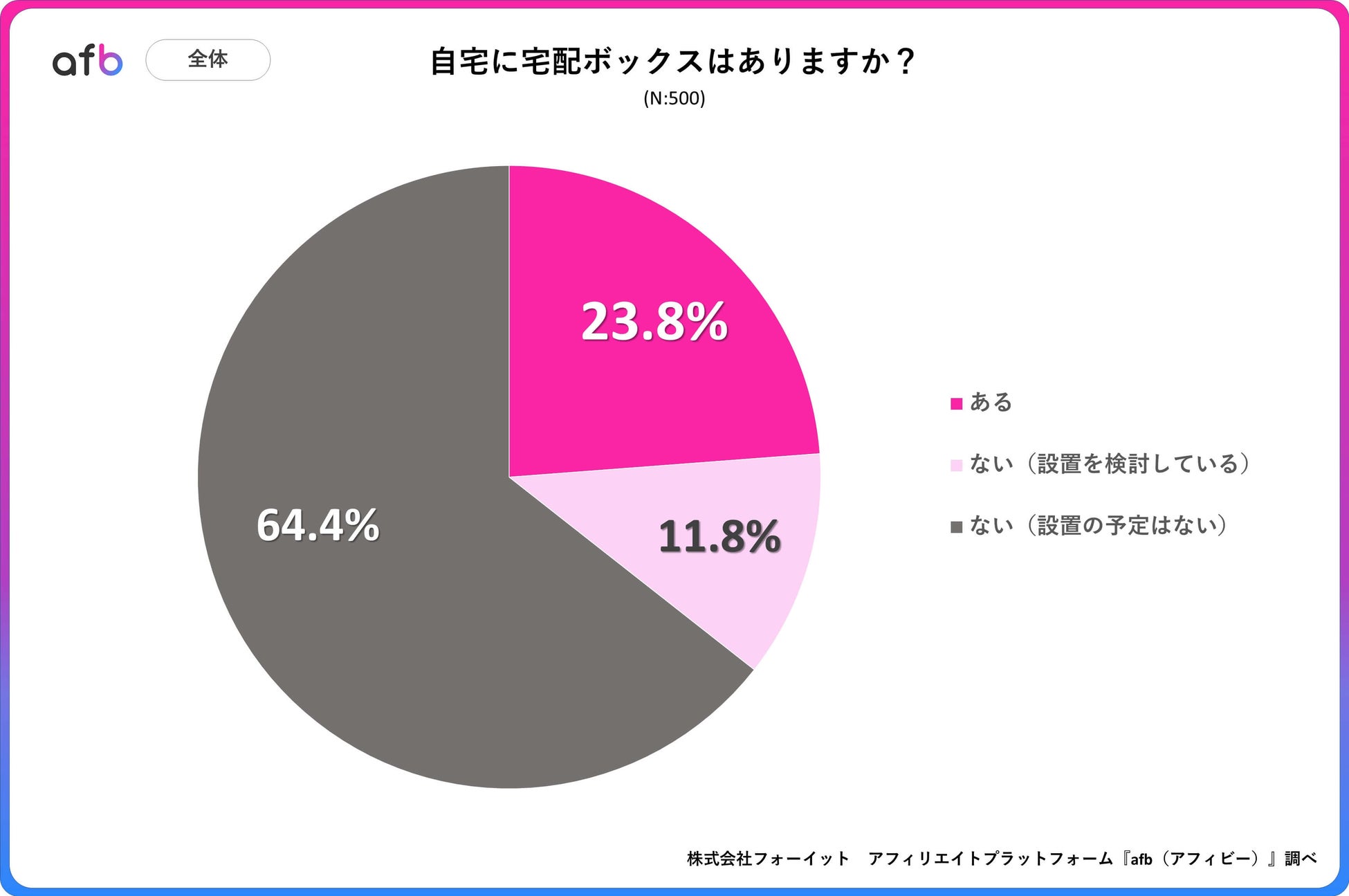 全国の20代〜60代の男女を対象に、「自宅に宅配ボックスはありますか?」というアンケートを実施したところ、「ある」と回答した方は23.8%でした。また、「ない(設置を検討している)」と回答した方は11.8%で、約35%の方が宅配ボックスを利用している、もしくは利用する予定だということが分かりました。