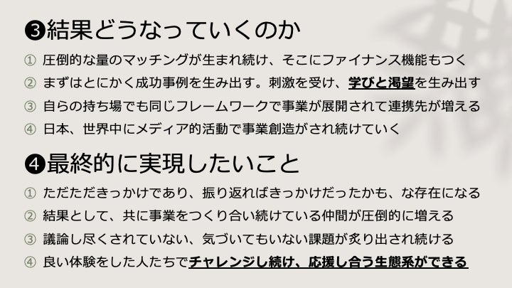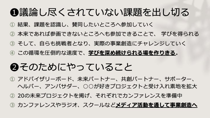 いずれも社会課題、社会的意義、業界課題の解決を大切にしており、議論し尽くされていない課題を抽出しいたします。そして、受け止め、実際にどうやったら納得感があるのか、を個人個人の方々が考えるまでのプロセスを作りたいと考えています。
