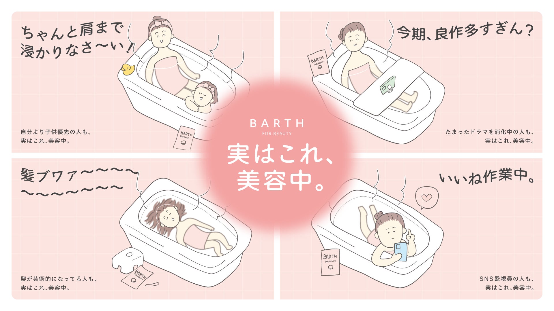 毎日忙しく頑張る方に向けて「忙しい日々の何気ない入浴時間も、『BARTH中性重炭酸入浴料BEAUTY』を使えば美容時間になっている」というメッセージを、脱力系のやさしいイラストと共に発信していきます。
