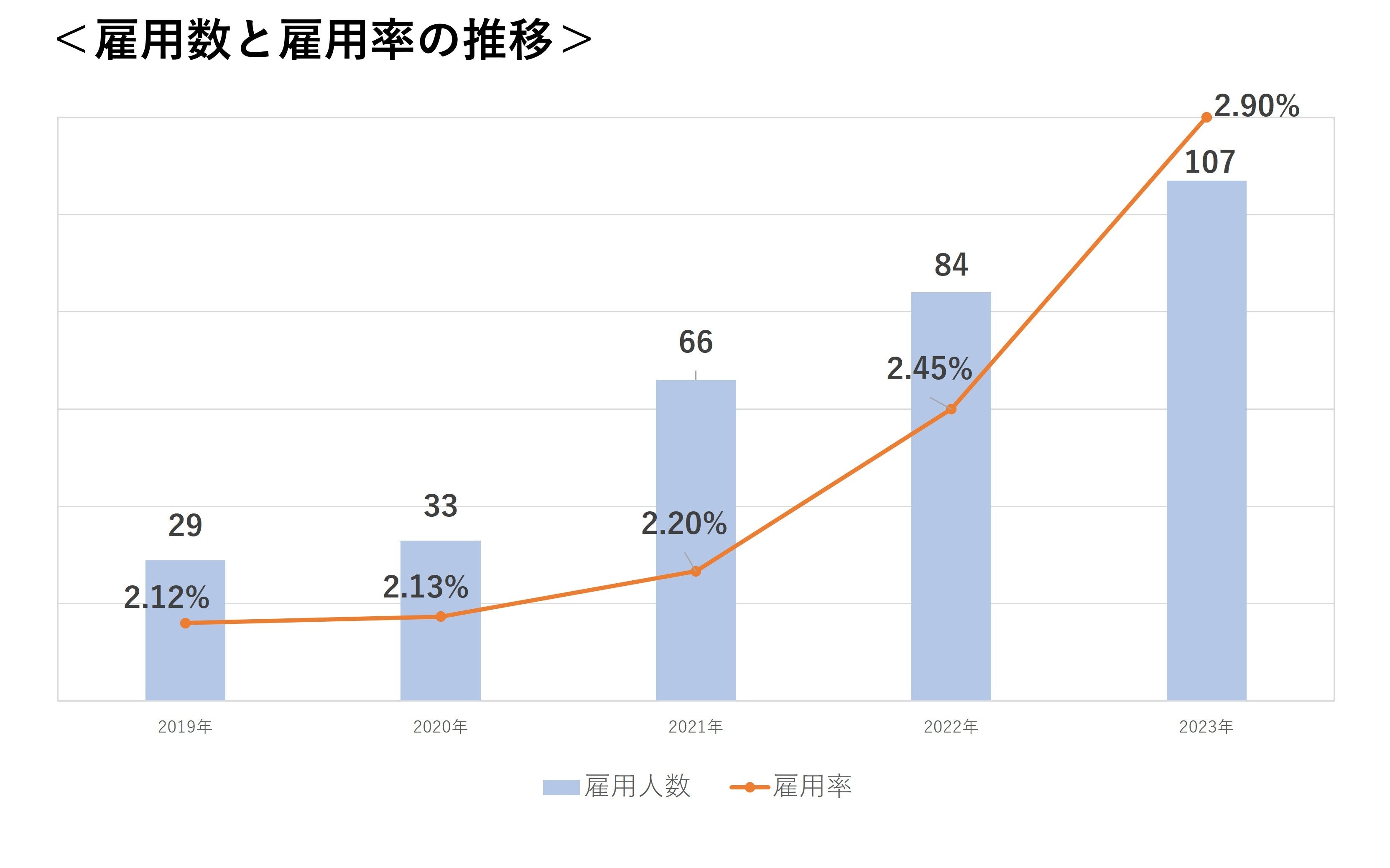 また2024年から段階的に引きあがる法定雇用率(目標2.7%)は達成しておりますが、誰もがやりがいをもって活躍できる社会の実現に向けて、より高い目標雇用率3.0%を設定し、積極採用を継続してまいります。また現在は中途採用のみですが、今後は新卒採用も視野に入れ準備しております。