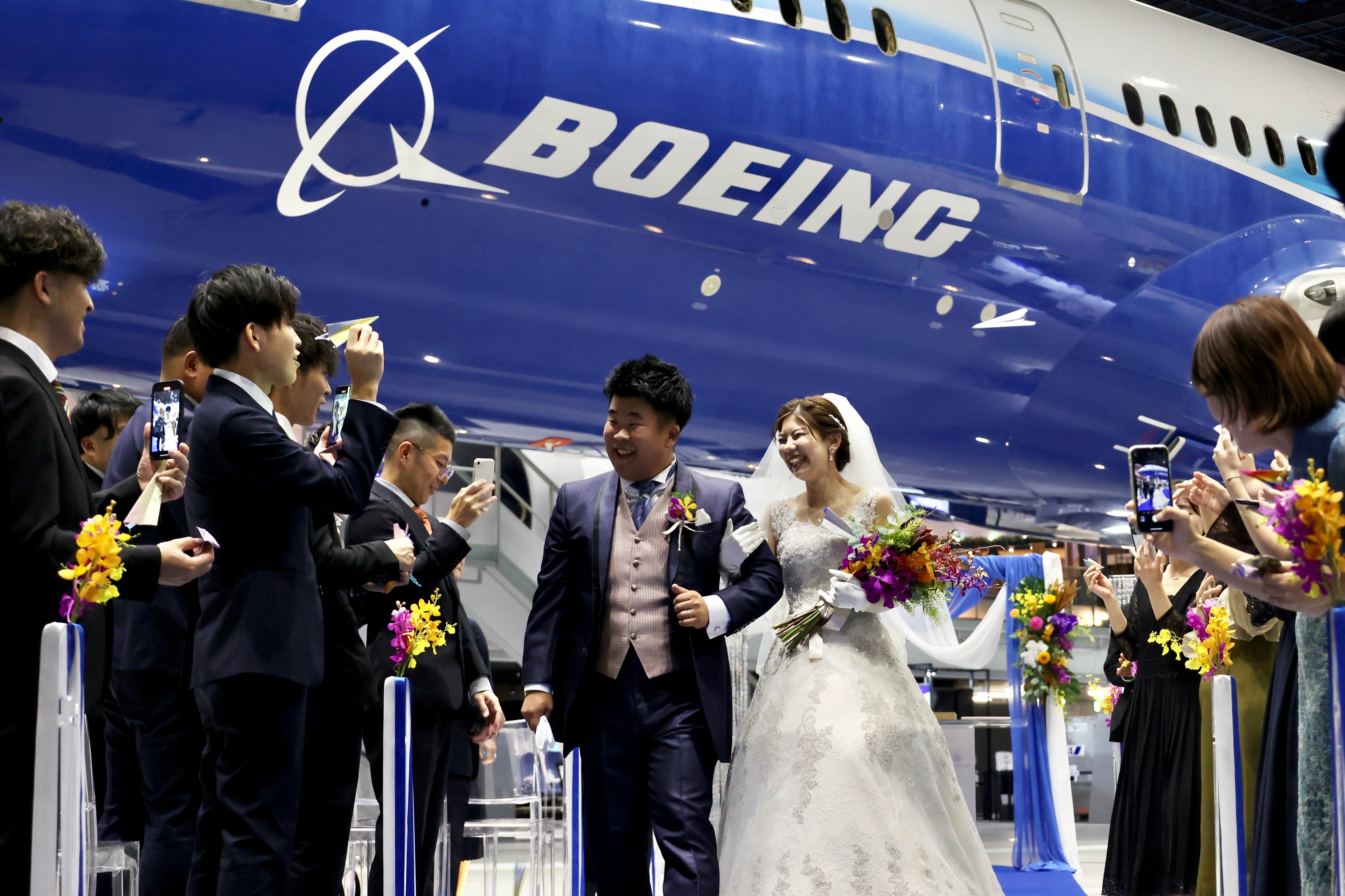 ボーイング787初号機の尾翼を見ながらの披露宴