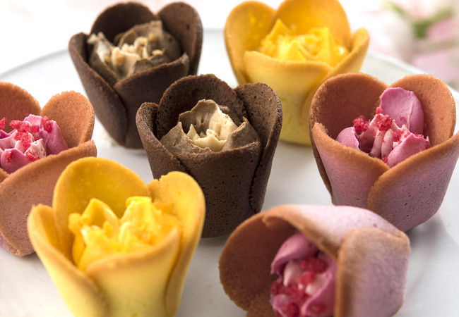 こんがり香ばしく焼きあげた芳醇ゴーダチーズのチューリップラングドシャの中に、4種のナチュラルチーズがとろけあうショコラローズ