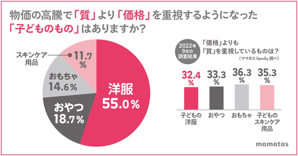 - 物価高の影響を受け、ママ自身&子ども関連のもので「質」より「価格」重視に変わったのは共に洋服が1位(ママ44.7%、子ども55.0%)