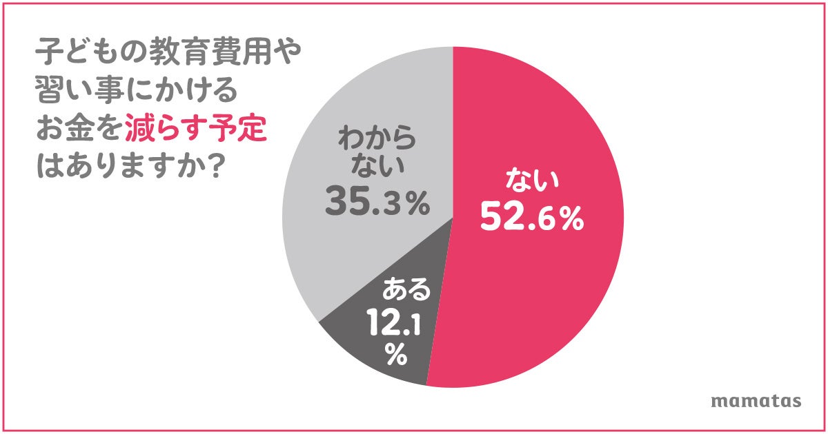 一方、子どもの教育費の削減する予定の人も12.1%、さらに35.3%は「わからない」と回答しており、今後の動向によっては削減する人としない人が拮抗しそうな気配も感じられます。