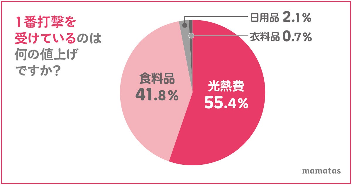 - 最も家計に打撃を受けているのは、光熱費55.4%、食料品41.8%。この2項目で97%超を占める。