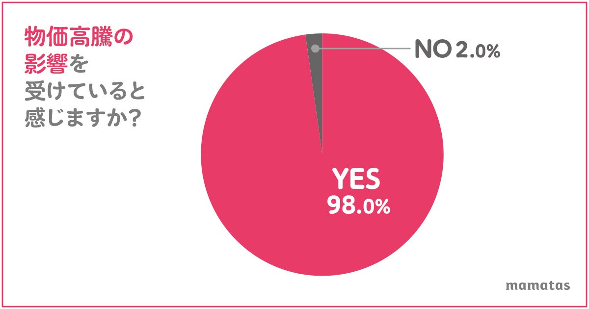 C Channel株式会社(本社:東京都港区、代表取締役社長:森川亮)が運営するInstagramNo.1(*1)ママ向け動画メディア「mamatas(以下、ママタス)」(総フォロワー数110万以上・https://www.mamatas.net/ )は、物価高騰についての緊急アンケートを実施。実に98%のママが物価高騰について影響を受けていると回答しました。