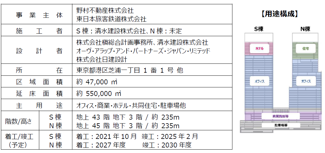 す。浜松町ビルディング(東芝ビルディング:東京都港区芝浦1-1-1)の建替事業として、ツインタワーの建設を予定しており、区域面積約4.7ha、高さ約235m、延床面積約55 万㎡の、オフィス・ホテル・商業施設・住宅を含む、約10 年間に及ぶ大規模複合開発として推進しています。