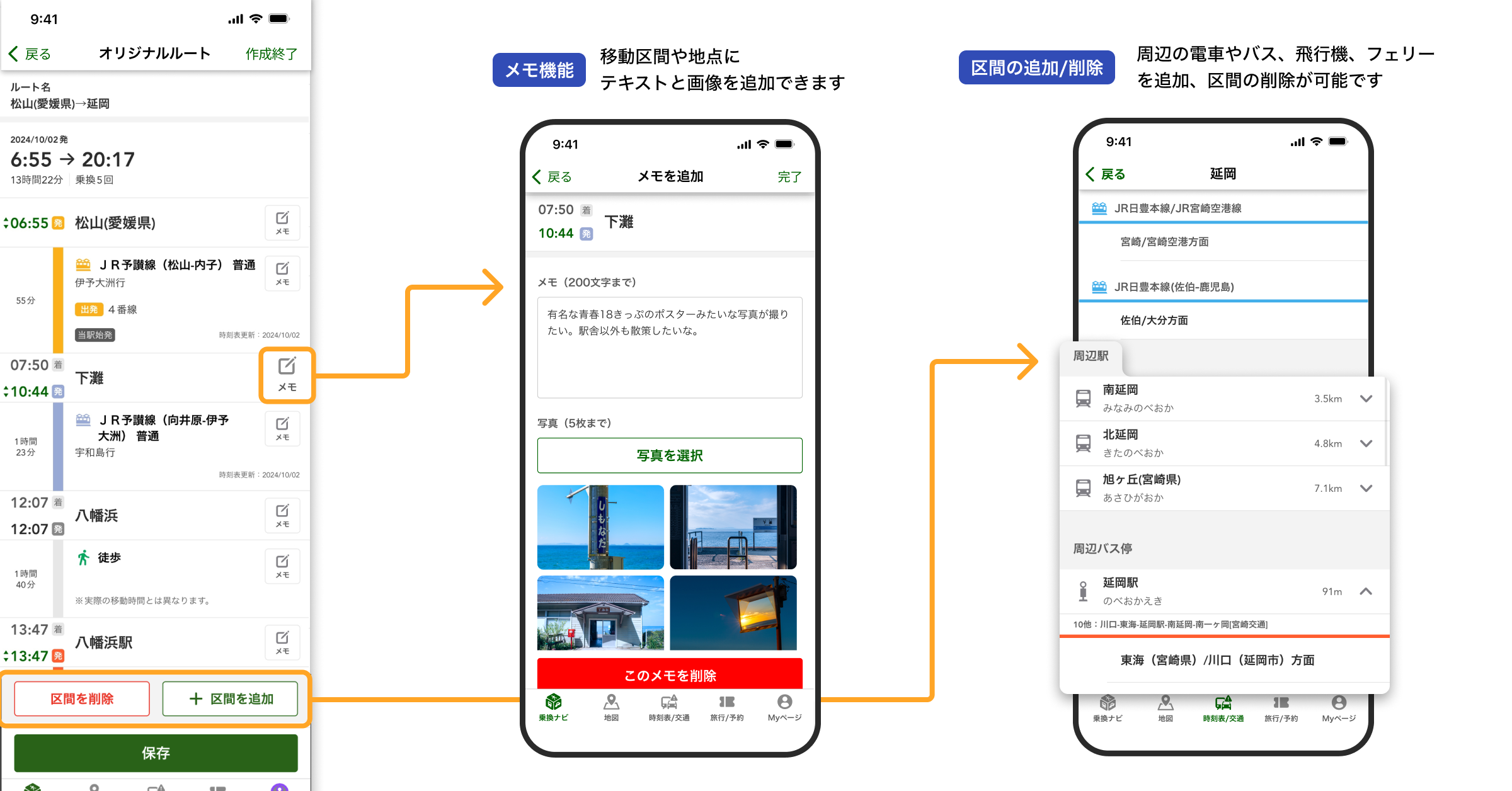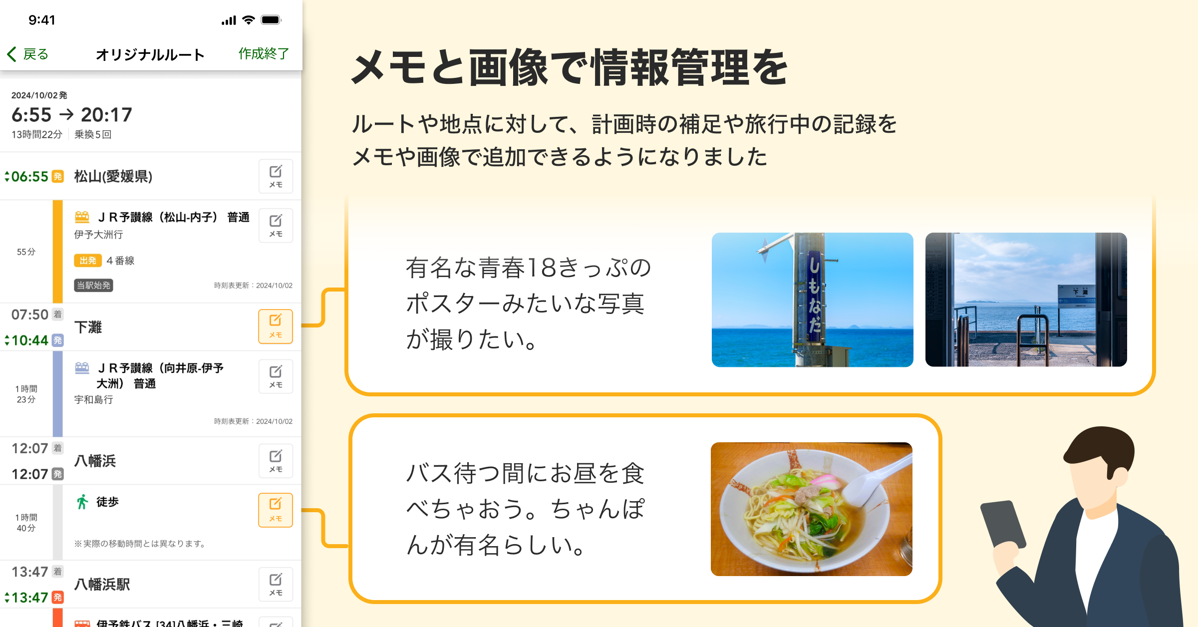 ・作成したオリジナルルート内の任意の移動区間や駅にメモや画像を追加できます