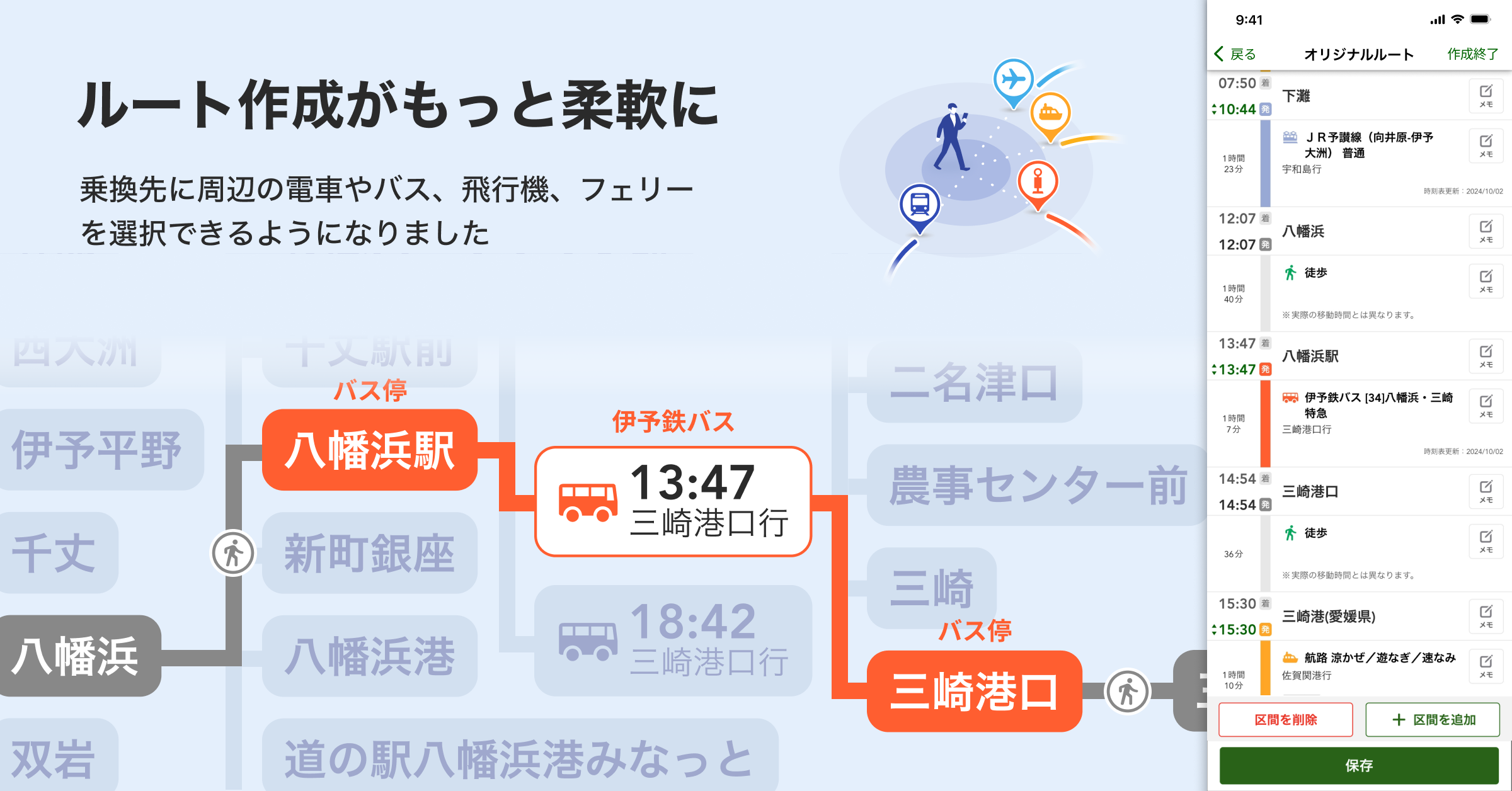 オリジナルルートの詳細画面に区間の追加/削除ボタンを追加し、ルート上の最後の移動区間に対して増減の修正が可能になります。追加ボタンから新たに電車やバス移動を増やしたり、削除ボタンからその区間を消去できます。