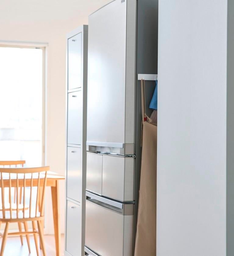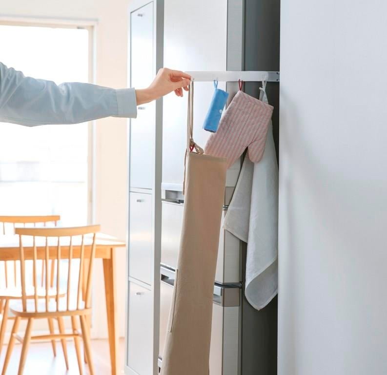 冷蔵庫まわりにミトンや、エプロン、輪ゴムなどたくさん掛けている小物。…すっきり見せたい。