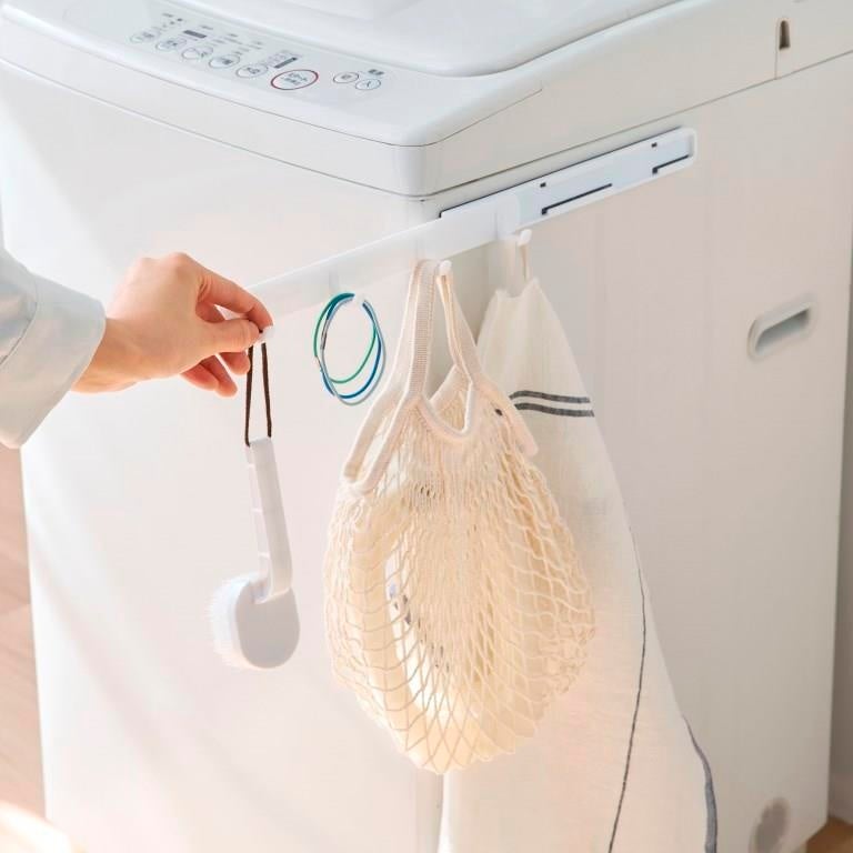 冷蔵庫や洗濯機のすき間にぴったりフィットする、磁石付きスライド4連フック。使わない時は隠して!必要な時だけシュッとスライドして取り出せる収納グッズ♪