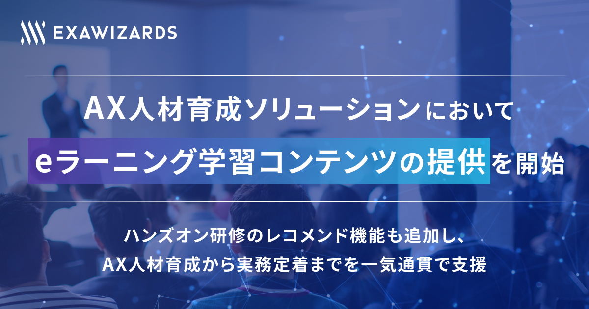 株式会社エクサウィザーズ(東京都港区、代表取締役社長CEO:春田 真、以下エクサウィザーズ)は、「AX人材育成ソリューション*1」においてeラーニング学習コンテンツである「AIリテラシーコース」の提供を開始しました。