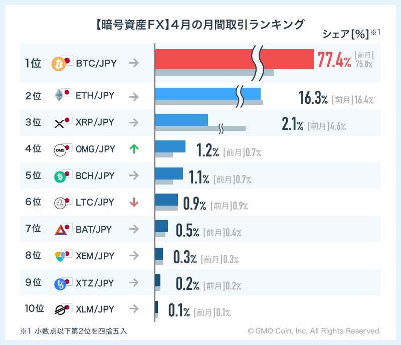 「暗号資産FX」では、BTC/JPYがシェア77.4%で首位となりました。