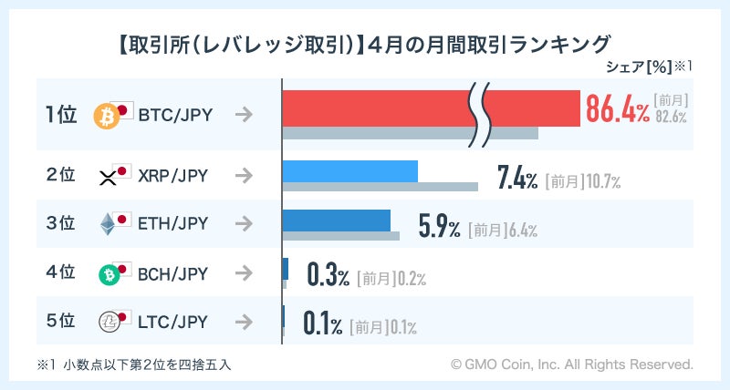 「取引所(レバレッジ取引)」では、BTC/JPYがシェア86.4%で首位となりました。