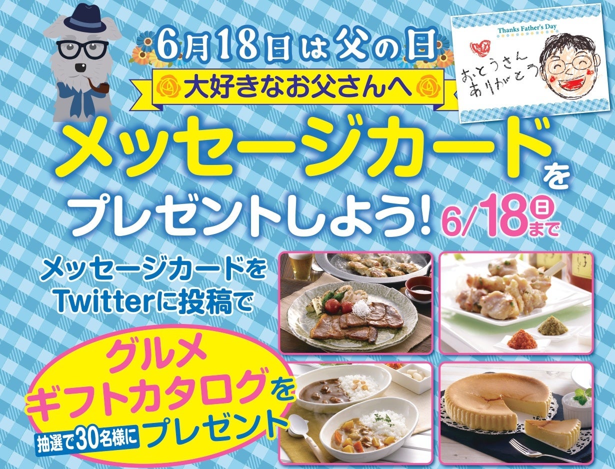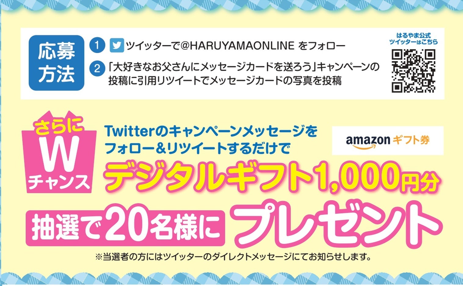 ビジネスパーソンの健康を応援・サポートする、はるやま商事株式会社(本社:岡山県岡山市、代表取締役社長 中村 宏明)は、父の日に向け『はるやま公式Twitterアカウント』にてキャンペーンを6月18日(日)まで実施いたします。はるやま公式Twitterアカウント(@HARUYAMAONLINE)をフォローし、該当キャンペーン投稿の引用リツイートにてメッセージカードの画像投稿をすると抽選で30名様にグルメギフトカタログ、Wチャンスとして、はるやま公式Twitterアカウント(@HARUYAMAONLINE)のフォロー&該当キャンペーン投稿のリツイートで抽選20名様にデジタルギフト1,000円分をプレゼントする企画となっております。