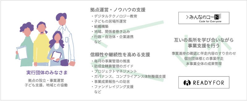 本事業は、テクノロジーを活用した居場所づくりの専門知見を持つ「みんなのコード」と、休眠預金活用事業の豊かな運営実績を持つ「READYFOR」がコンコンソーシアム体制ソーシアム(共同体)を形成して推進しました。