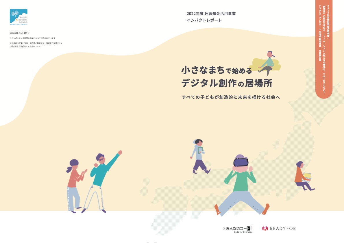 READYFOR株式会社(所在地:東京都千代田区、代表:米良はるか)と特定非営利活動法人みんなのコード(所在地:神奈川県横浜市、代表理事:杉之原 明子)は、休眠預金活用事業「『創造性』の格差を埋める〜イノベーション人材となる機会を、すべての子どもに〜 デジタルテクノロジー×居場所創造事業(以下、本事業)」の成果をまとめた2022年度 休眠預金活用事業 インパクトレポートを公開しました。